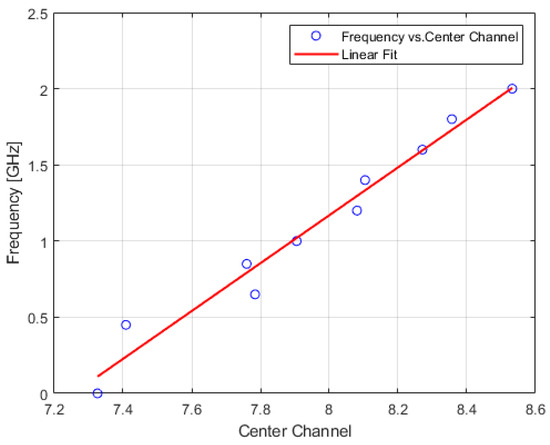 In Figure 6, the y-axis represents the deviation of the laser center frequency from the standard value, and the x-axis represents the change in the position of the fringe center. By performing a linear fit on the obtained results, a linear relationship between the center channel and laser center frequency variation can be obtained. The slope of the fitted curve represents the pixel resolution. From the graph, the system’s pixel resolution was estimated as 1.571 ± 0.082 GHz, allowing for a frequency domain range of 25.136 GHz for the 16 channels. Utilizing the frequency-position relationship of each channel, the entire linear model was fitted using the three Lorentz linear models. The center and FWHM of the Lorentz lines on both sides of the center represent the frequency shift and linewidth of the Brillouin scattering spectrum, respectively.
