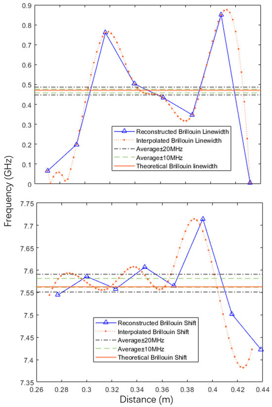 Figure 12 shows the fitted results of the Brillouin linewidth (top) and Brillouin shift (bottom) obtained from Lorentzian linear fitting at a temperature of 25.1 °C and salinity of 0.1‰. It should be noted that, because of the inability to achieve strictly normal incidence, we could only ensure that the incident light was within an incidence angle of less than 0.5° to reduce the asymmetric impact caused by multilevel interference. Therefore, the Brillouin frequency shift and linewidth shown in Figure 12 are the average values of the fitting results for both sides. As shown in Figure 12, the fitted Brillouin linewidth of the Brillouin peaks on both sides of the central Rayleigh peak yielded a value of 0.481 GHz. The analysis of the Brillouin shift is shown in Figure 12, where the result of 1000 integrations is relatively stable and the average Brillouin shift is 7.56 GHz. By performing an arithmetic mean analysis on the fitting results of the peak region of the echo signal, it was observed that the error between the fitted results and standard reference value was within 10 MHz.