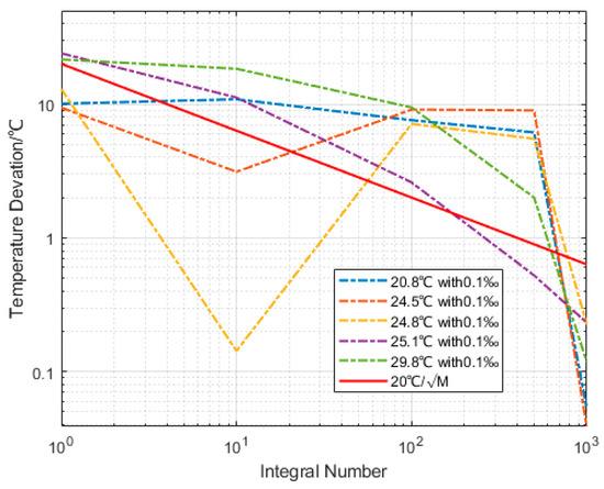 To validate the accuracy and stability of the system for temperature measurements, we utilized a temperature control device to increase the water temperature and maintain its stability. We collected a total of five echo signals at temperatures of 19.1 °C, 20.8 °C, 24.5 °C, 25.1 °C, and 29.8 °C and a salinity concentration of 0.1‰. In Figure 13, M represents the integral number. These signals were subjected to signal processing and inversion, resulting in the performance of the system at different temperatures, as shown in Figure 13. Individual echo signals exhibited higher inversion errors because of their lower signal-to-noise ratios. However, as the number of integrations gradually increased, the temperature inversion errors began to converge.