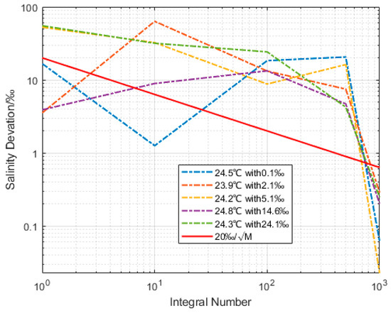From Figure 14, it appears that when the number of integrations reaches 1000, the inversion results for the five reference salinity levels can achieve an accuracy of ±0.16‰, with a maximum error of ±0.29‰ and a minimum error of ±0.02‰.