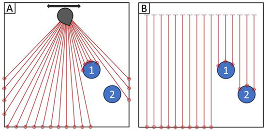 Simplified illustration of (A) the viewing angle issue that typical 2-D LiDAR faces because of rotating from a fixed point and (B) a 1-D LiDAR array capable of capturing both objects.