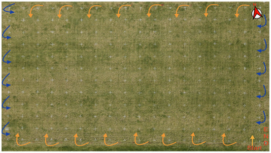 The field set-up utilized for data collection and ground truthing at the University of Guelph Turfgrass Institute in Guelph, ON, Canada, during the summer/fall of 2021. The field was separated into 187 2 × 2-metre grid spaces. The orange arrows represent the movement of the Gryphon Turf Canopy Scanner (GTCS) vertically across the field in approximately a north-south pattern this was followed by movement horizontally across the field in approximately an east-west pattern.