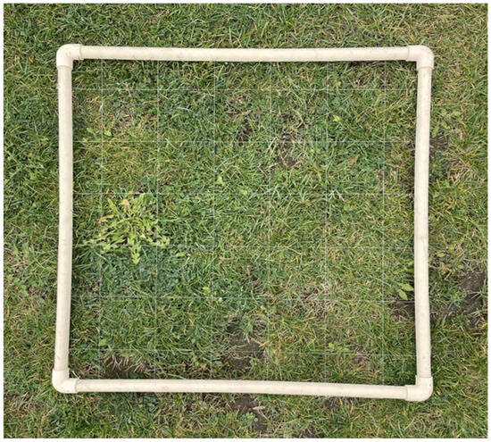 Point quadrat used to ground truth the field at the Guelph Turfgrass Institute in Guelph, ON, Canada, in 2021. Ground truthing was used to identify bare versus healthy grass, where the points directly under the intersection of the wires were evaluated for a total of 36 points per point quadrat measurement.