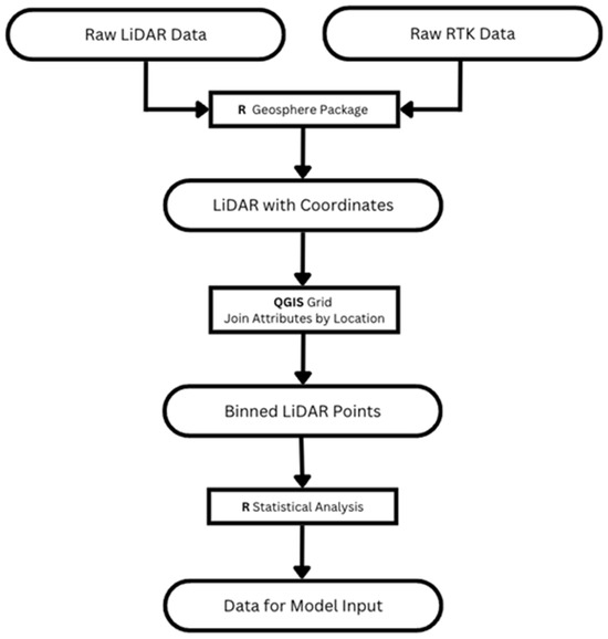 A flowchart depicting data processing is highlighted in Figure 5. The LiDAR data were post-processed to calculate the mean and the standard deviation of the grass height within each bin. Z-score normalization of the data was used to preprocess the raw data before machine learning. Our machine learning and statistical models had only two input features (the mean and the standard deviation of the grass height), which is why the random forest and the nonlinear regression models were selected. These models allowed for the development of highly practical and simple-to-use models programmable within Microsoft Excel (Redmond, DC, USA). Our goal was to develop a farmer-focused sod management tool that matches the available skill sets and training readily available for practical applications within the sod-growing community.
