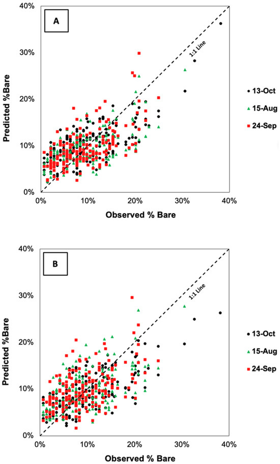 Percent bare values were determined based on the point quadrat observations, either bare or grass. The observed percent bare values were correlated (R2 = 0.44) to the regression model’s (Equation (3)) predicted values (Figure 6) and had a lower correlation (R2 = 0.35) with the random forest prediction. A comparison of dates revealed that the 13 October 2021 date showed the most variation in bare percentage.