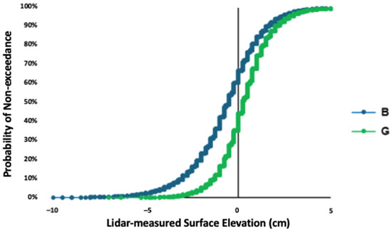 Figure 7 presents the cumulative distributions of LiDAR-measured surface elevations (cm) for the bin with the highest bare percentage (B; bin 154) and the bin with the highest grass percentage (G; bin 169) for the 14 October 2021 scan. It is visible in the distributions that the average height of the grass is higher in bin 169 than in bin 154, and its curve is further right.
