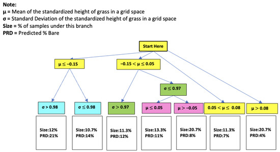 A decision tree was created utilizing the mean and standard deviation of normalized heights of the field (Figure 9). The predictions (PRD) where the mean is less than −0.15 lead to a PRD of 21% and 14%, respectively. All means greater than −0.15 had a PRD 12%, with descending percentages as mean height increased. Additionally, the nodes where standard deviation was used as a branching point resulted in higher PRDs than those that used the mean.