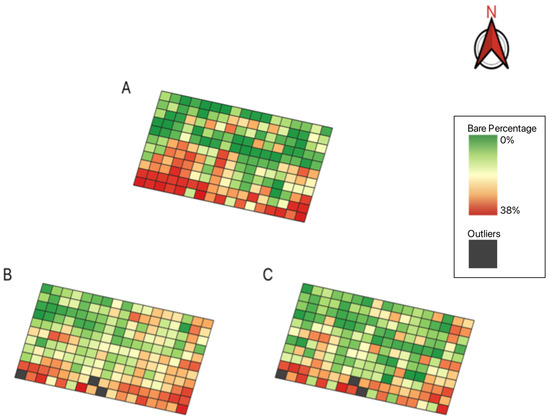 Figure 10 depicts a graphical representation of the field, where comparisons can be made for a bare percentage between the ground-truth data (Figure 10A), the regression model (Figure 10B), and predicted values from the random forest model (Figure 10C). Scans for the maps were taken in October 2021, and three grid spaces were removed due to data outliers. The three maps identify a high percentage of bare grid spaces along the south side of the field (Figure 10). The random forest model was able to predict 70/184 (38%) with a percent bare value greater than 10% compared to the ground-truth and regression model data, which identified 78/187 (42%) and 90/184 (49%), respectively.