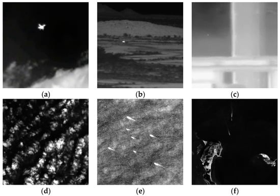 Comparison of IR images between maritime scenes and other scenes. (a–c) represent IR images with sky, mountainous and urban, respectively; (d–f) represent IR images with complex cloud, ocean waves and islands, respectively.