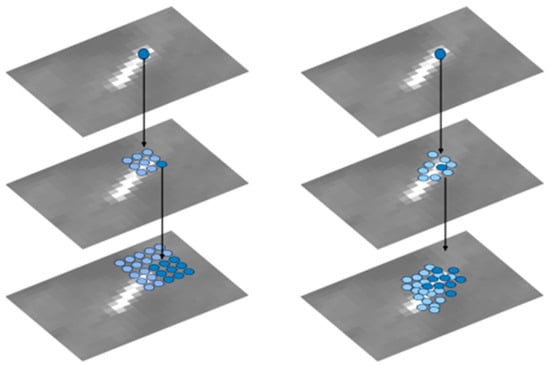 Dilated convolutions [] expand the coverage of convolution kernels by inserting gaps between standard convolutional units, thereby enhancing the network’s receptive field without compromising resolution. As illustrated in Figure 2, the essence of dilated convolutions lies in a hyperparameter called dilation rate, defining the number of gaps between points in the convolution kernel. When the dilation rate is 1, dilated convolutions degenerate into standard convolution operations. With increasing dilation rates, the coverage area of the convolutional kernel grows exponentially. For instance, a 3 × 3 convolutional kernel with a dilation rate of 2 covers an area equivalent to that of a 5 × 5 kernel, without incurring additional computational overhead.
