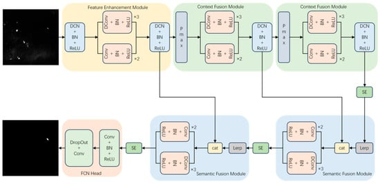 The model proposed in this paper is based on an encoder-decoder architecture. Given the limited pixel occupancy of small targets in images, traditional encoder layers with four levels of downsampling may lead to feature loss. Therefore, we opt for only two encoder and decoder layers. Figure 4 illustrates the network structure of FCNet, comprising one feature enhancement module (FEM) and two context fusion modules (CFM) in the encoder, two semantic fusion modules (SFM), three squeeze-and-excitation (SE) blocks, and one FCN Head in the decoder. Initially, the original image is fed into the FEM. The FEM consists of two deformable convolutions and a joint module of standard convolution and dilated convolution (CDCFM), amalgamating multiple convolutions to yield enhanced feature maps. Subsequently, the enhanced feature maps are input into two CFMs. CFM comprises a max-pooling layer, a CDCFM, and a deformable convolution layer, extracting fused information from contextual and local aspects to mitigate information loss during encoding. During the upsampling process, we employ the SFM. Initially, this module linearly interpolates the feature maps conveyed from the encoder layers for upsampling. It then integrates shallow semantic information and amalgamates deep and shallow semantic information through a CDCFM. Additionally, during upsampling, we introduce three SE blocks []. The SE block, a form of channel attention mechanism, aids in learning weights for different channels to attain superior feature representation. Ultimately, we utilize the FCN Head to output segmentation results.