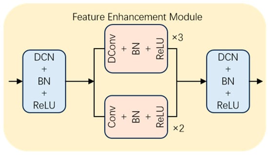Here, DCN(·) denotes deformable convolution, DConv(·) denotes dilated convolution, with the superscript 3 indicating the operation of dilated convolution performed three times, Conv(·) denotes standard convolution, with the superscript 2 indicating the operation of standard convolution executed twice, and the symbol signifies direct addition of the corresponding values from the feature maps, followed by normalization through the ReLU function.