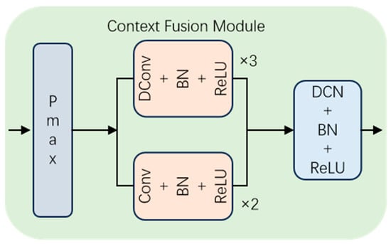 Our proposed CFM aims to fuse contextual information after pooling, thereby reducing the loss of contextual information. As depicted in Figure 6, the input feature map undergoes maximum pooling to yield feature map . Subsequently, undergoes contextual information fusion via the CDCFM to obtain feature map . Finally, after adjusting the shape of receptive fields through DCN to preserve edge information, the output feature map is obtained. Through two successive CFM module treatments in the encoder, feature map is ultimately obtained. The detailed computational procedures are elucidated in Equations (3) and (4):