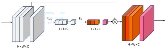 The SE block stands as a highly effective channel attention mechanism, characterized by its minimal parameter and computational footprint. Through straightforward compression and excitation operations, it discerns weightings across different channels, thereby acquiring enhanced feature representation. As illustrated in Figure 8, the SE block initiates by subjecting the input feature map to spatial feature compression, effectuated through global average pooling across spatial dimensions, yielding the feature map . Subsequently, via a fully connected (FC) layer, it derives a feature map imbued with channel attention. The feature map , augmented with channel attention, and the original input feature map X undergo channel-wise multiplication by the weight coefficients, culminating in the output of a feature map endowed with channel attention.
