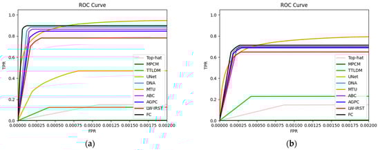 ROC curves of different methods. (a) Maritime-SIRST; (b) NUDT-SIRST-SEA.
