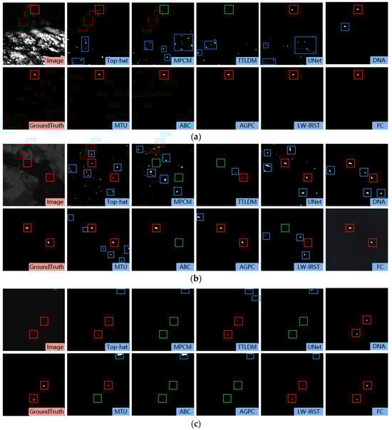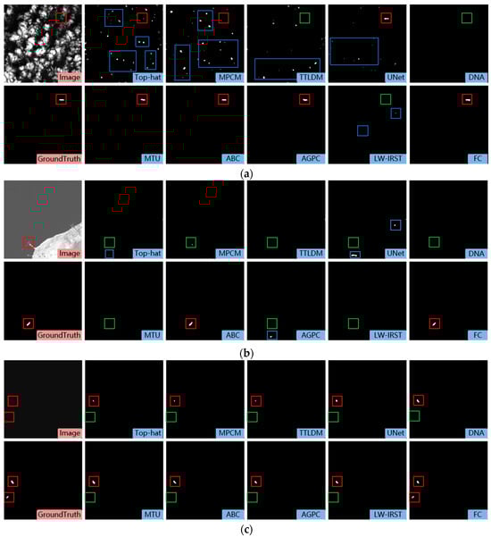 Partial image visualization results of different methods on NUDT-SIRST-SEA. The red box, the blue box, and the green box represent the correct detection box, the false detection box, and the missed detection box, respectively. Some algorithms exhibit an excessive number of false alarms; hence, annotations are omitted in the images. (a) Showcase the image segmentation results with cloud clusters; (b) demonstrate the image segmentation results with islands; (c) illustrate the image segmentation results with dim small ships.