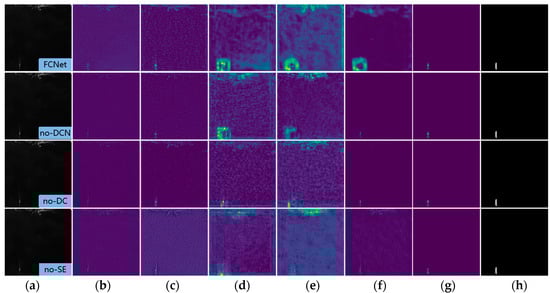 To obtain a more intuitive understanding of the roles played by DC, DCN, and SE in the network, we visualized the feature maps at each stage of the FCNet network model. As shown in Figure 14, no-DCN represents the FCNet model without the DCN module, no-DC represents the FCNet model without the DC, and no-SE represents the FCNet model without the SE. From Figure 14, it can be seen that the network without DCN loses a lot of edge information near the target; the network without DC lacks contextual semantic information in the encoding stage; and the network without SE has chaotic channel information in the feature map, with insufficient prominent features near the target.