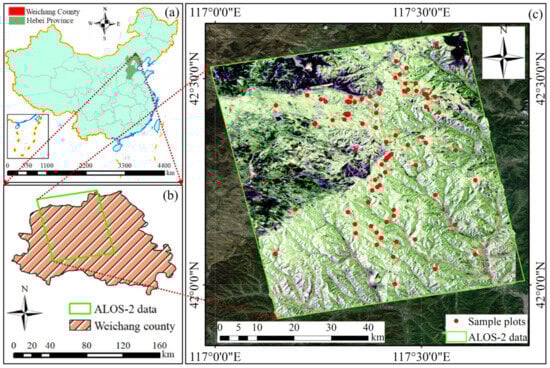 Overview of study sites: (a) the location of Saihanba Forest Farm in relation to the provinces and counties in China; (b) the spatial location of ALOS-2 data relative to Weichang County; (c) the Pauli RGB image (R: |HH-VV|, G: |HV|, B: |HH + VV|) based on PolSAR data and the location of the measured samples; the basemap is the optical image of Tianditu.