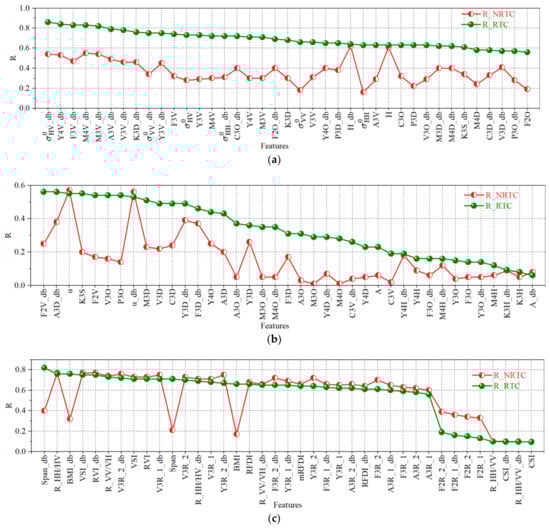 In order to quantitatively analyze the impact of the radiometric terrain correction (RTC) process on the correlation between forest AGB and PolSAR features, we first set the non-RTC (NRTC) data as the blank control and the RTC data as the test data. The core correction factors of the RTC process are shown in our previous study [40]. Secondly, we extracted a total of 117 effective PolSAR features (as mRFDI_db is invalid) based on NRTC and RTC data. Subsequently, Pearson correlation coefficients (R) were calculated separately between forest AGB and each of the PolSAR features (Table A1, Appendix B). Finally, in order to compare and visually present the changes in the R-values of the NRTC data and RTC data and, at the same time, reveal the relationship between various PolSAR features and forest AGB correlation strength after RTC, we sorted and plotted them according to the absolute R-values of the data (25 July 2020) after RTC (Figure 3).