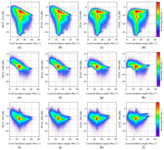 Taking PolSAR data from 25 July 2020 as an example, we created scatter density plots between the decibel values of the three components (Volume scattering component (Vol), Surface scattering component (Odd), and Double-bounce scattering component (Dbl)) of the Freeman three-decomposition in different topographic correction stages (non-radiometric terrain correction (NRTC), polarization orientation angle correction (POAC), effective scattering area correction (ESAC), and angular variation effect correction (AVEC)) and the local incidence angle θloc. (a) NRTC_Vol; (b) POAC_Vol; (c) ESAC_Vol; (d) AVEC_Vol; (e) NRTC_Odd; (f) POAC_Odd; (g) ESAC_Odd; (h) AVEC_Odd; (i) NRTC_Dbl; (j) POAC_Dbl; (k) ESAC_Dbl; (l) AVEC_Dbl.