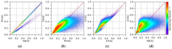 In order to further analyze the specific mechanism of influence of different stages of RTC (POAC, ESAC, and AVEC) on each component of polarization decomposition, taking PolSAR data from 25 July 2020 as an example, we plotted the scatter density (Figure 5) of each component of Freeman3 decomposition at each stage of different RTC relative to the previous stage.