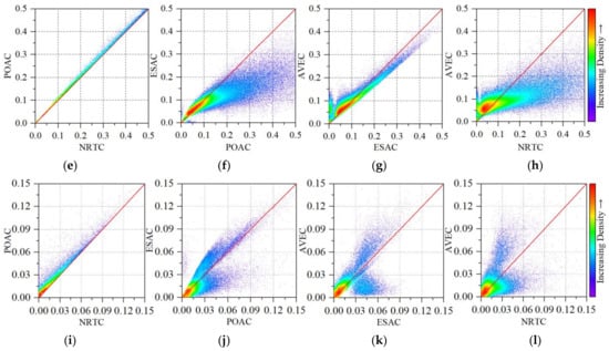 In the comparison stage between POAC and NRTC (Figure 5a,e,i), POAC caused the intensity values of almost all pixels of the Vol component (Figure 5a) to decrease, while the intensity values of almost all pixels of the Odd (Figure 5e) and Dbl components (Figure 5i) showed an increasing trend. This suggests that the absence of POAC will lead to an overestimation of Vol and an underestimation of Odd and Dbl. In addition, the correction of the ESAC and AVEC stages did not cause the pixel intensity value of the polarization decomposition component to undergo an overall increase or decrease, but there was an increase or decrease in the pixel value in each component. This is because the correction factors of ESAC and AVEC stages depend on both the value of the local incidence angle of each pixel and its relationship with the radar incidence angle, which also indicates that the correction effects of ESAC and AVEC stages are closely related to the ground conditions in the study area. However, in the ESAC phase, most of the pixels that cause a large change in the intensity value of the pixel (away from the 1:1 line) were decreasing, while in the AVEC phase, the situation was the opposite. This indicates that going without ESAC will lead to a more serious overestimation of some pixels, while going without AVEC will lead to a more serious underestimation of some pixels. Moreover, the effect of RTC on the three polarization decomposition components cannot be described by a simple law of increase and decrease because the correction effect of RTC is the superposition of the three stages (Figure 5d,h,l).
