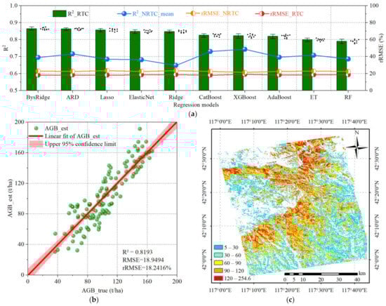 Analysis of the effectiveness of RTC and the optimal regression model of this study, taking the SAR data from 25 July 2020 as an example. (a) The training results of the NRTC and RTC data, where the black dots are the results of the corresponding single training; (b) scatter plot of the measured forest AGB and the AGB predicted by the optimal regression model (BysRidge); (c) spatial distribution map of forest AGB in the study area based on optimal model prediction.