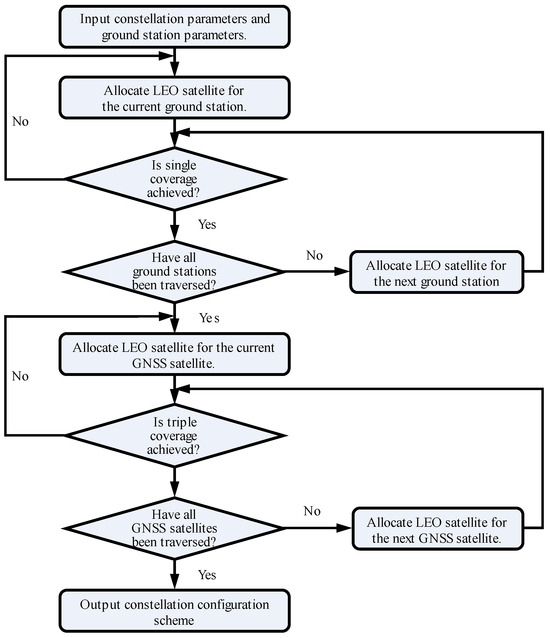 In the DCA, each ground station’s requirement for single coverage by LEO satellites is solved individually, requiring addition operations and logical operations each time. This step is repeated times. Then, for each GNSS satellite, the requirement for triple coverage by LEO satellites is solved individually, requiring addition operations and logical operations each time. This step is repeated times.