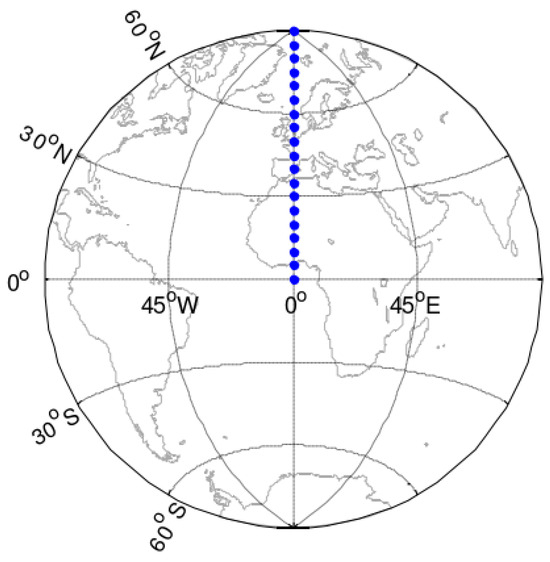Due to the symmetrical characteristics of global coverage in the east-west and north-south hemispheres within a complete orbital period of the constellation, only 19 ground stations in the northern hemisphere along the 0° longitude from 0° to 90°N, sampled every 5°, are selected for simplicity when evaluating global coverage performance [31], as shown in Figure 11.