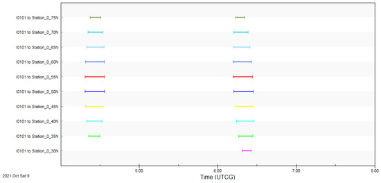 Through simulation analysis using STK 11.6 software, it was found that over a period of 7 days, there are a total of 152,190 visible links between the LEO constellation and the 19 ground stations, all of which are intermittent, with durations ranging from 1.1 s to 14.8 min. For example, Figure 12 shows the set of visible links between the LEO satellite I0101 and a ground station over a period of 4 h. For the LEO satellite I0101, there are a total of 19 intermittent links within this 4-h period. Similarly, the visibility situation between 216 LEO satellites and the ground stations over 7 days is even more complex and variable.