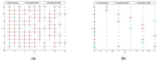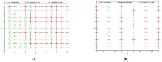 Constellation distribution map of the resource allocation scheme by GA. (a) Inclined orbit satellites. (b) Near-polar orbit.
