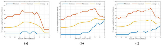 Based on the resource allocation schemes obtained from different algorithms in Table 3, the set of visible links between the LEO constellation and the ground stations can be used to derive the global coverage performance of the different constellation resource allocation schemes, as shown in Figure 16. The results indicate that all three constellation allocation schemes meet the requirement for single coverage at all times. Additionally, the average minimum coverage multiplicities for ground stations achieved by the constellation allocation schemes obtained from the three algorithms are 1.2, 3.2, and 2.5, respectively; the average coverage multiplicities are 4.5, 7.9, and 7.5, respectively; and the maximum coverage multiplicities are 8.7, 13.2, and 12.7, respectively.