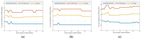 Based on the resource allocation schemes obtained from different algorithms in Table 3 and the set of visible links between the two constellations, the coverage performance of different constellation allocation schemes for the BDS satellites can be derived, as shown in Figure 17. The results indicate that all three constellation resource allocation schemes meet the requirement for triple coverage at all times. Additionally, the average minimum coverage multiplicities for all BDS satellites achieved by the constellation allocation schemes obtained from the three algorithms are 3, 3, and 22.7, respectively; the average coverage multiplicities are 6, 8, and 30.3, respectively; and the maximum coverage multiplicities are 7.7, 11.3, and 37.4, respectively.