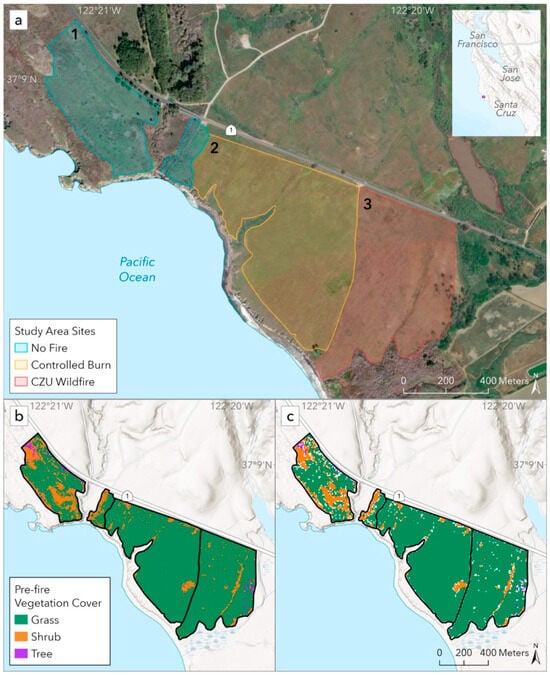 The study area is a coastal grassland located within Año Nuevo State Reserve in San Mateo County, California (Figure 1a). Within this area, there are adjacent sites with three different fire histories: an area that has undergone state-led controlled burns every two to three years since 1991 (and most recently in the fall of 2017, 2020, and 2023), an area that burned in the CZU wildfire complex in August and September 2020, and an area that has not experienced fire of any kind for over 100 years (Figure 1a). We refer to these three sites as the controlled burn, wildfire, and no fire sites, respectively. The CZU wildfire burned at a very high severity within the study area and caused significant vegetation mortality. A field survey conducted in April 2022 revealed the extensive mortality of trees and shrubs as a result of the wildfire, with many shrubs just beginning to resprout. The controlled burn that was the focus of this study was conducted in November 2020 and burned at low severity [14].