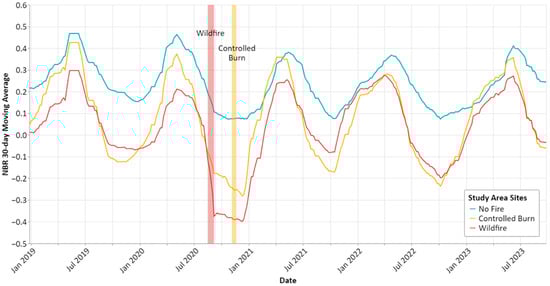Thirty-day moving average of the mean NBR values across each study area site during the study period (31 December 2018 to 30 September 2023). The timing of the wildfire and controlled burn events are shown as labeled vertical bars shaded in red and orange, respectively.