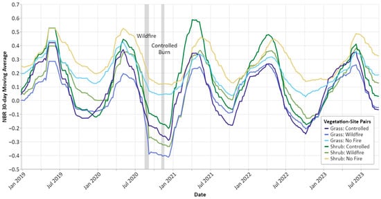 Thirty-day moving average of the mean NBR values within the Sentinel-2 pixels dominated by grasses, shrubs, and trees within each study area site across the study period (31 December 2018 to 30 September 2023). The wildfire site experienced significant vegetation mortality and vegetation type changes during and after the fire; therefore, the vegetation categories should not be interpreted as remaining constant in the period following the fire. The timing of the wildfire and controlled burn events are shown as labeled vertical bars shaded in gray. Tree-dominated pixels were excluded from this figure due to small sample size and to facilitate legibility.