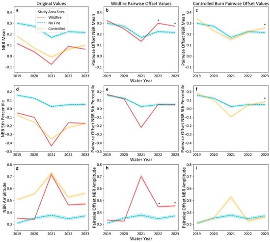 Mean metric values (NBR mean, fifth percentile, and amplitude) from 200 randomly sampled pixels on each of the three sites across the five water years of the study period. The first column (a,d,g) shows the original NBR values; the second column (b,e,h) shows the pairwise offset values (i.e., the average difference between the pre-fire WY 2019 and 2020 values on each fire site and the no fire site) for the wildfire site; and the third column (c,f,i) shows the pairwise offset values for the controlled burn site. The pairwise offset values illustrate the relative differences between the fire sites and no fire site following the fires, which were statistically tested in WYs 2022 and 2023. Asterisks (*) above the pairwise offset values in WYs 2022 and 2023 indicate that the means of the two sites were significantly different using the Mann–Whitney U test (padj < 0.05). The shaded bounds surrounding each line represent the 95% confidence interval of each sample.