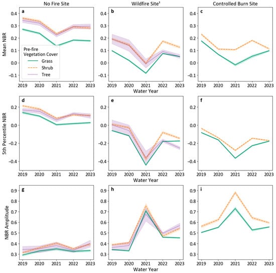 Average metrics (NBR mean, fifth percentile, and amplitude) from the sampled pixels dominated by each pre-fire vegetation type (grass, shrub, and tree) across the five water years of the study period. The columns correspond to the no fire, wildfire, and controlled burn sites from left to right. In order, (a) shows the mean NBR by vegetation type on the no fire site, (b) shows the mean NBR by vegetation type on the wildfire site, and (c) shows the mean NBR by vegetation type on the controlled burn site; (d) shows the fifth percentile NBR by vegetation type on the no fire site, (e) shows the fifth percentile NBR by vegetation type on the wildfire site, and (f) shows the fifth percentile NBR by vegetation type on the controlled burn site; (g) shows the NBR amplitude by vegetation type on the no fire site, (h) shows the NBR amplitude by vegetation type on the wildfire site, and (i) shows the NBR amplitude by vegetation type on the controlled burn site. The shaded band surrounding each line represents the 95% confidence interval of that sample. A note on variation in the sample sizes: 200 pixels were randomly sampled from each site–vegetation cover pair except in the following four cases: all 168 and 139 shrub-dominated pixels were selected from the controlled burn and wildfire sites, respectively, and all 27 and 19 tree-dominated pixels were selected from the no fire and wildfire sites, respectively. 1 The wildfire site experienced significant vegetation mortality and vegetation type changes during and after the fire; therefore, the pre-fire vegetation categories should not be interpreted as remaining steady in the years during and after the fire.