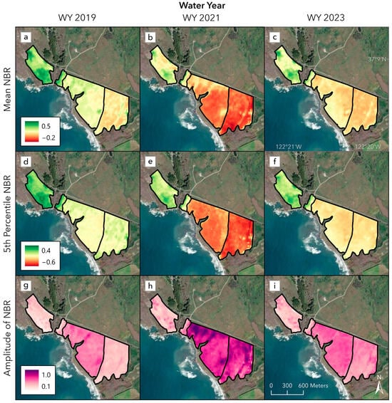 Spatial variation in the mean, fifth percentile, and amplitude of NBR across the study area sites for three water years: two years prior to the fire events (WY 2019), the year of the fire events (WY 2021), and two years after the fire events (WY 2023). In the first row, the maps show the (a) mean NBR in WY 2019, (b) mean NBR in WY 2021, and (c) mean NBR in WY 2023. In the second row, the maps show the (d) fifth percentile NBR in WY 2019, (e) fifth percentile NBR in WY 2021, and (f) fifth percentile NBR in WY 2023. In the third row, the maps show the (g) amplitude of NBR in WY 2019, (h) amplitude of NBR in WY 2021, and (i) amplitude of NBR in WY 2023.