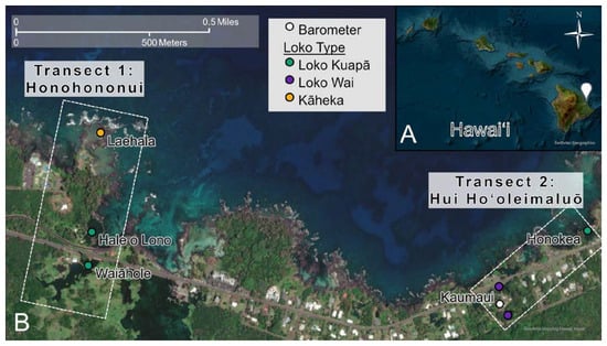Location of where the study sites are located within the Hawai′i archipelago (A). The loko i′a are situated along the Eastern Keaukaha Coastline on Hawai′i island (B). Each marker in both Transects represents the location of an in situ water sensor. The loko i′a within Honohononui (Transect 1) are Laehala (orange), Hale o Lono (green), and Waiāhole (green). Within Hui Ho′oleimaluō (Transect 2), the loko i′a are Honokea (green) and Kaumaui (purple). The location of the barometer (white) is also indicated.