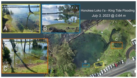 Observed UAV King Tide flooding (0.64 m) documented on 3 July 2023 at Honokea loko i′a with ground-truthed photos in the field. Observations include inundation at the main freshwater spring (A), high water levels intruding on Native bird habitat (B), and flooding causing debris to spread (C).
