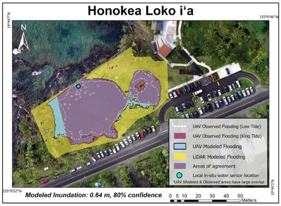 Globally, the use of UAVs is growing as a preferred method to support integrated coastal zone management encompassing cultural heritage sites [43,44]. Previous studies have used UAVs to document and preserve historical sites [45], conduct geometric surveys in inaccessible coastal environments [46], monitor Indigenous heritage sites in the face of climate change [47], and conduct geoarchaeological surveys [48]. UAVs have also been used to capture and monitor real-time changes caused by environmental and anthropogenic factors [49,50], document changes to the nearshore marine environments [51,52,53,54,55], and characterize flooding caused by natural disasters [56,57]. Our study contributes to this growing body of research in remote sensing [58] by showing that UAVs can identify and quantify real-time flooding at loko i′a. Furthermore, building upon bathtub flood modeling that only considers elevation, flooding captured by our UAV-derived orthomosaic improves the understanding of how other environmental variables, such as the groundwater, wave action, geology, and infrastructure, may influence local water levels. Other environmental variables, such as precipitation, air temperature, and swell strength, have been studied to increase groundwater flooding impacts on West Hawai′i [59], which is currently observed to impact the loko i′a on the east side. Additionally, high-surf advisories issued for the Hilo district during extreme tides have been reported to break mākāhā, collapse kuapā, and restrict road access due to extremely rough and high water action along the coasts.