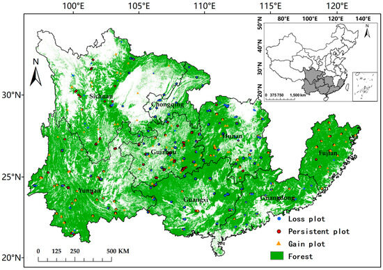 The locations of the study area, provinces, and the sampling plots representing persistent forest, forest gain, forest loss, and non-forest areas.