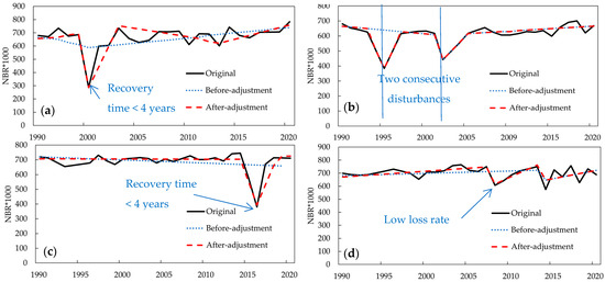 The LandTrendr identified breakpoints for disturbance events with the optimized and the default (original) parameter values at four randomly-selected sampling plots (a–d) based on the fitted NBR change magnitudes.