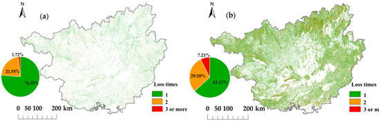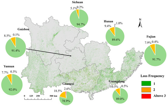 With a detection window of 5 years, the frequency of forest disturbance during 1990–2020 was mainly dominated by one or two disturbance times (Figure 12). For the entire study region, about 88.5% of the forest loss areas were one-time disturbance and 11.50% of the forest loss areas were disturbed twice or more times. At a provincial scale, there were large differences in the proportions of disturbance frequency. Guangxi and Guangdong had the highest proportions of two or more times of forest disturbance, especially in the Guangxi Province where 21.05% of the forest loss areas have experienced two or more disturbance times, which is significantly higher than other provinces. The proportion of twice or more forest loss areas was the lowest in the Sichuan Province (5.32%).