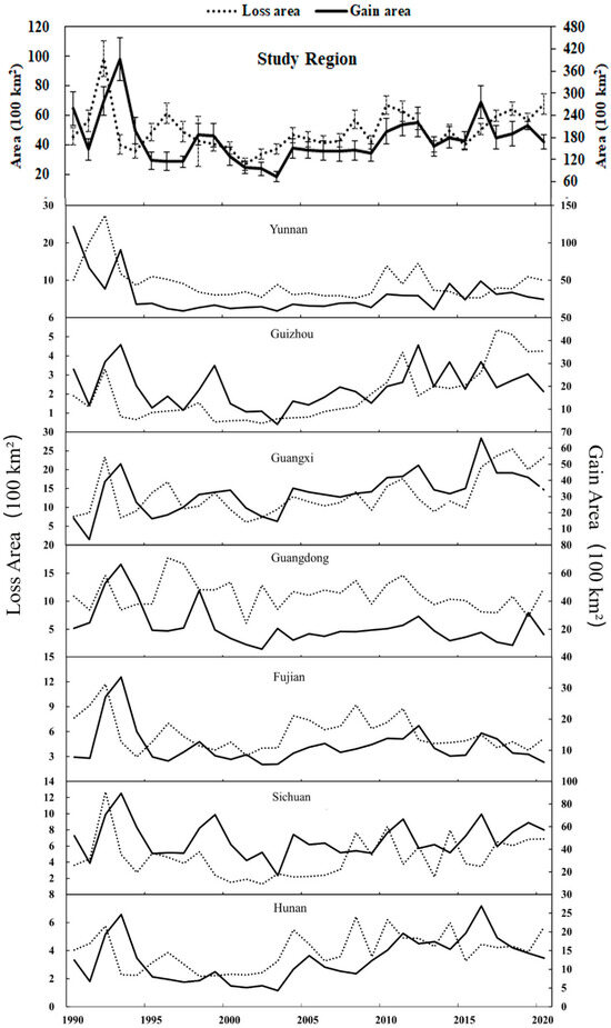 At provincial levels, the Sichuan and Guangxi Provinces had the greatest gain area of 1.51 × 105 km2 and 1.01 × 104 km2, respectively, while the Hunan and Fujian Provinces had the smallest loss area of 3.53 × 104 km2 and 3.92 × 104 km2, respectively (Figure 7). The gain rates relative to the forest area in 1990 were the highest in Guangxi (193%) and Guizhou (271%) and the smallest in Hunan (58.1%) and Fujian (70.6%). All provinces showed the largest forest gain area in 1993. Similarly, the Guizhou, Guangxi, Hunan, and Sichuan Provinces showed significant increasing trends of 47.9 km2/year, 96.7 km2/year, 50.0 km2/year, and 45.8 km2/year, respectively, during 1994–2020, while other provinces showed no significant changing trends.