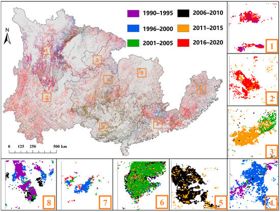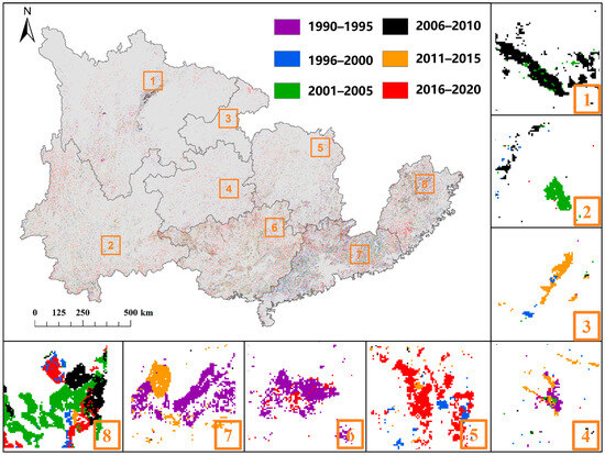 The spatial distribution of forest loss area and occurrence years in southern China. Note: the boxes from 1 to 8 are magnified areas (scaled to 1:10,000) to show clearer spatial patterns in forest loss area and years.