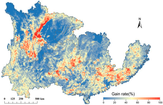 On a spatial scale, forest gain was more widely distributed than forest loss (Figure 10). Similar to the loss area, the forest gain areas were relatively more distributed in the forest edge areas. Most of the recovered forest areas were located in the loss area since forest recovery after loss is the main gain regime. From the magnified areas, we can also more clearly see that the forest loss area of each year is mainly concentrated as large patches since both forest recovery after loss and afforestation occurred with clustered patterns. Scaled-up to a 10 km spatial resolution, the forest gain fraction was further analyzed (Figure 11). The results indicated that central Sichuan, eastern Guangdong, southeastern Guizhou, and western Guangxi had the largest forest gain fractions which were higher than 80% at a 10 km spatial resolution.