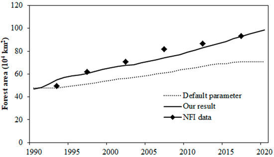 The comparison of the detected forest area during 1990–2020 using improved parameters (black line) and default parameters (dotted line) with the National Forest Inventory (NFI) statistical data (discrete points).