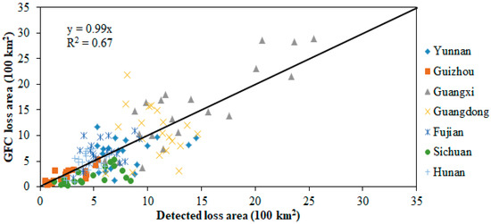Comparisons of our detected annual forest loss area in different provinces with the global forest change (GFC) product [4].